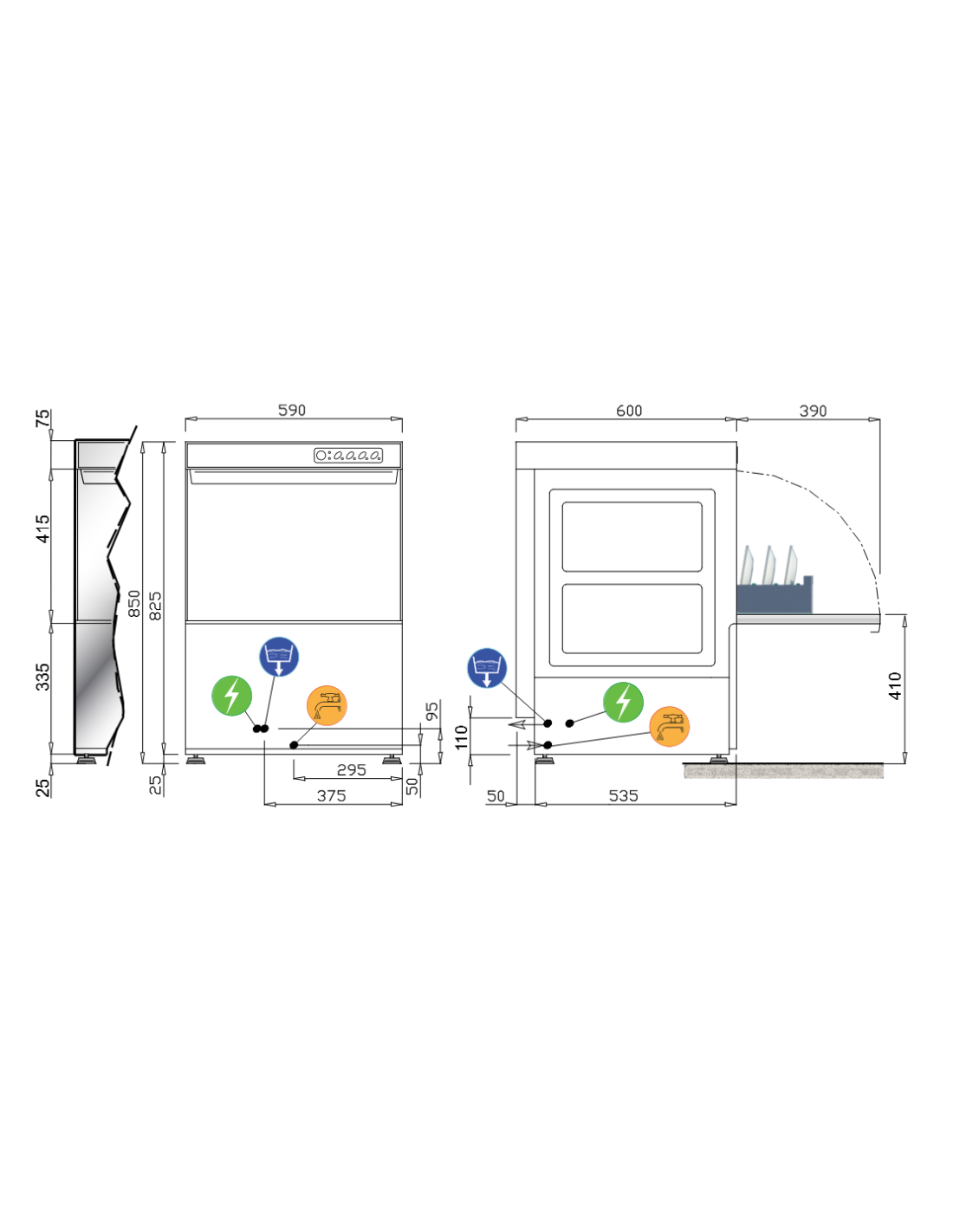 Lavapiatti con cesto cm 50 x 50 - Comandi elettronici - Altezza max bicchieri cm 32 - Diametro piatti cmm 34.5 - Ciclo (sec) 90' - 120' - 180' - Alimentazione trifase V400/3/50Hz - Cm 59 x 60 x 85 h