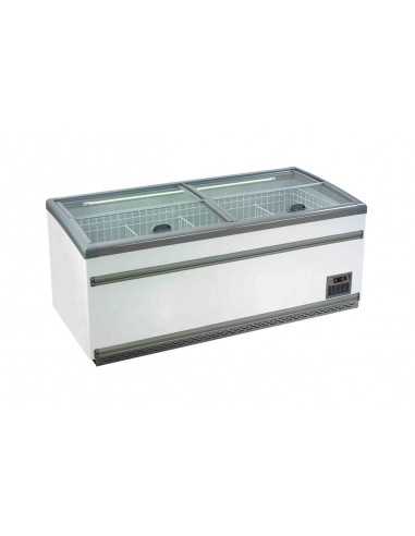Isola refrigerata - Mod. IGLOO21 - Capacità lt 850 - Vetro piatto inclinato - Temperatura -18°/-21°C - Refrigerazione statica - No frost - N.4 Separatori - Dimensioni cm 210 x 85 x 87 h