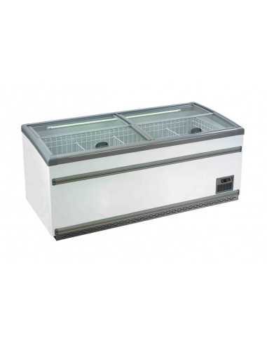 Isola refrigerata - Mod. IGLOO25 - Capacità lt 1040 - Vetro piatto inclinato - Temperatura -18°/-21°C - Refrigerazione statica - No frost - N.5 Separatori - Dimensioni cm 250 x 85 x 87 h