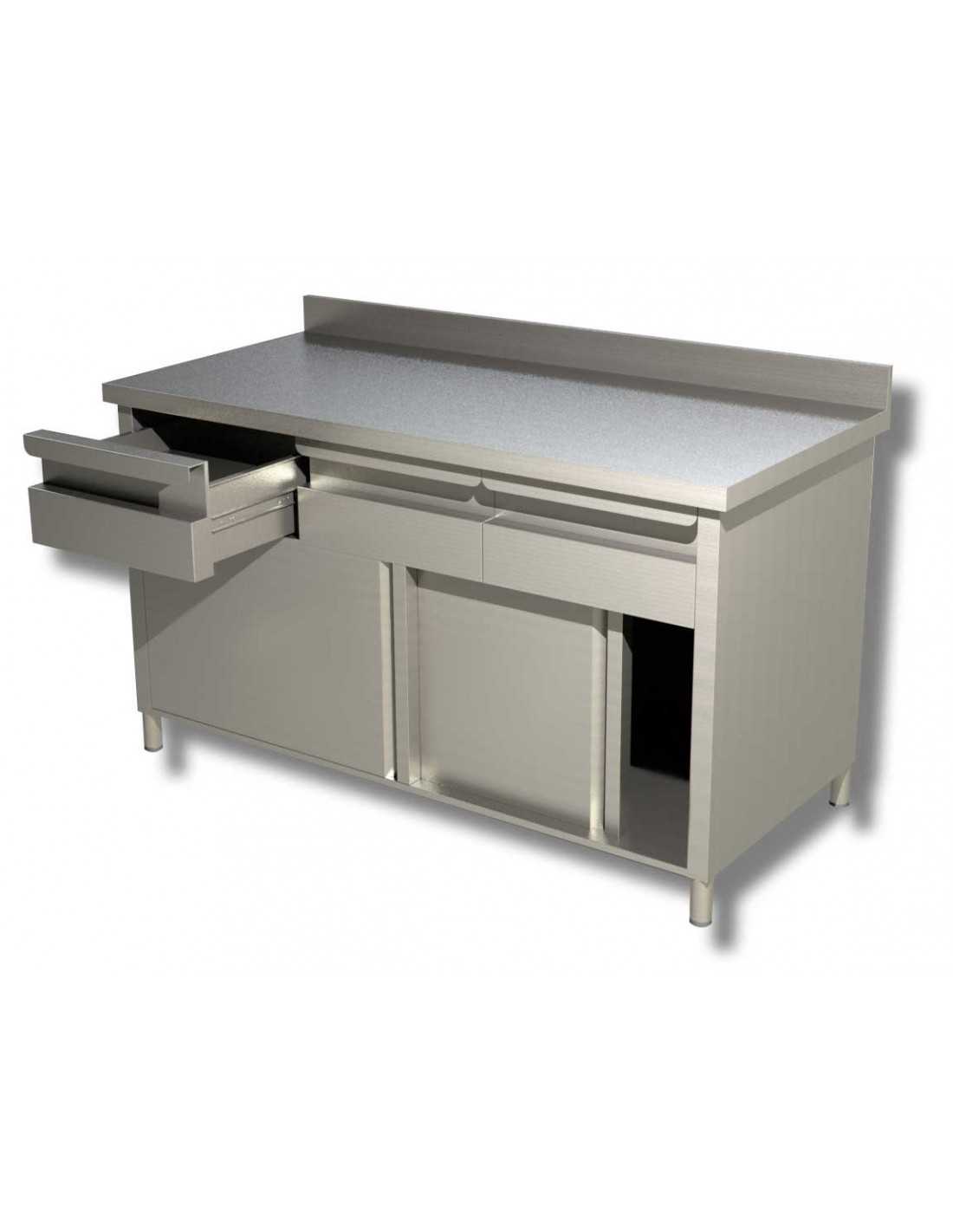 Tavolo da lavoro inox - Modello DSTA2C - In acciaio inox Aisi 430 - Alzatina - Porte scorrevoli - Con cassetti - Spessore piano superiore cm 4 - Profondità 70 - Dimensioni varie